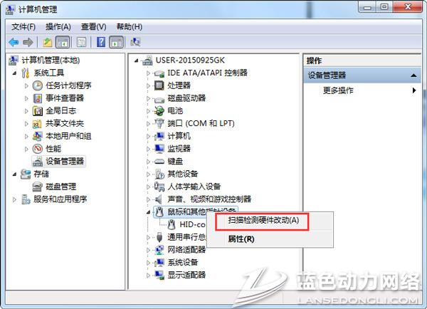 1、尝试在设备管理器中打开“鼠标和其它设备“选项,在鼠标选项上点击鼠标右键选择卸载鼠标驱动后在鼠标选项上点击鼠标右键,选择扫描硬件改动,重新加载驱动测试,如图: