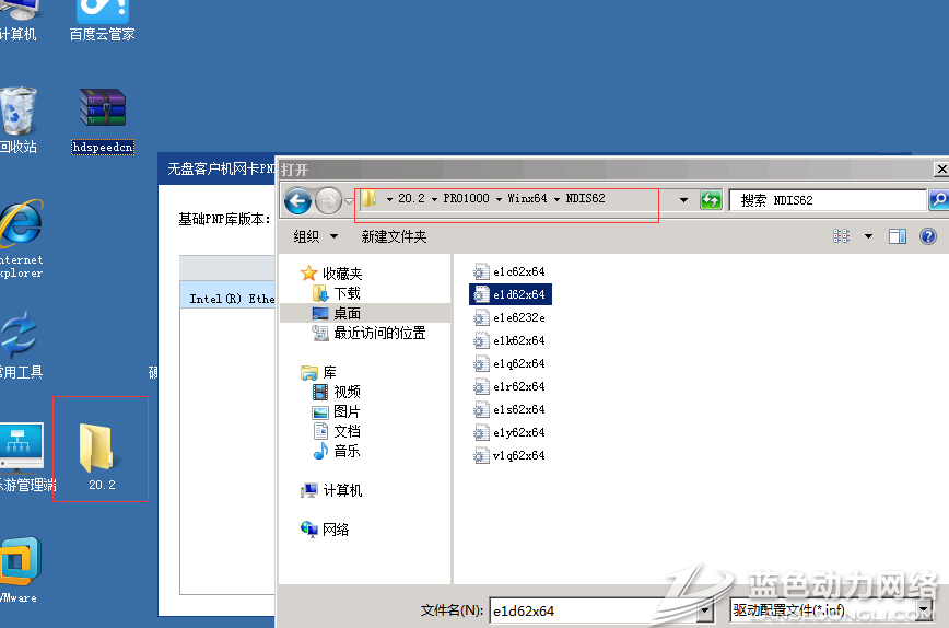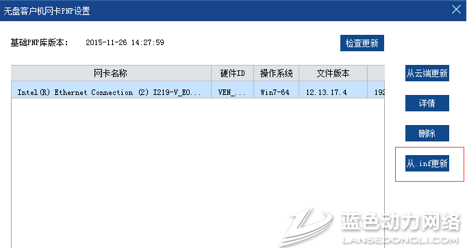 2.打开网卡PNP设置,选中对应的网卡驱动,点击从inf更新,选择桌面上解压出来的驱动目录,选择PRO1000/winx64/ndis62/e1d62X64,点击打开;
