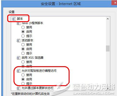 3.最后一步,找到“脚本”位置,然后定位到“允许对剪贴板”,勾选启用,完成之后点击窗口下方的确定保存设置即可。