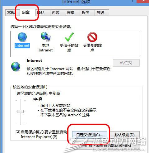 2.之后,单击打开窗口上方的工具-internet选项,再打开的internet选项窗口中,将界面切换到安全这一栏中,然后点击下方的“自定义级别“按钮。