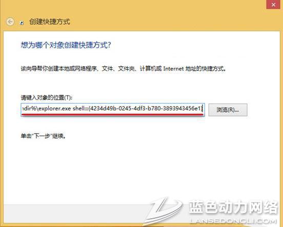 2、在创建快捷方式的“请键入对象的位置”输入代码“%windir%/explorer.exe shell:::{4234d49b-0245-4df3-b780-3893943456e1}”,然后单击“下一步”,如下图所示: