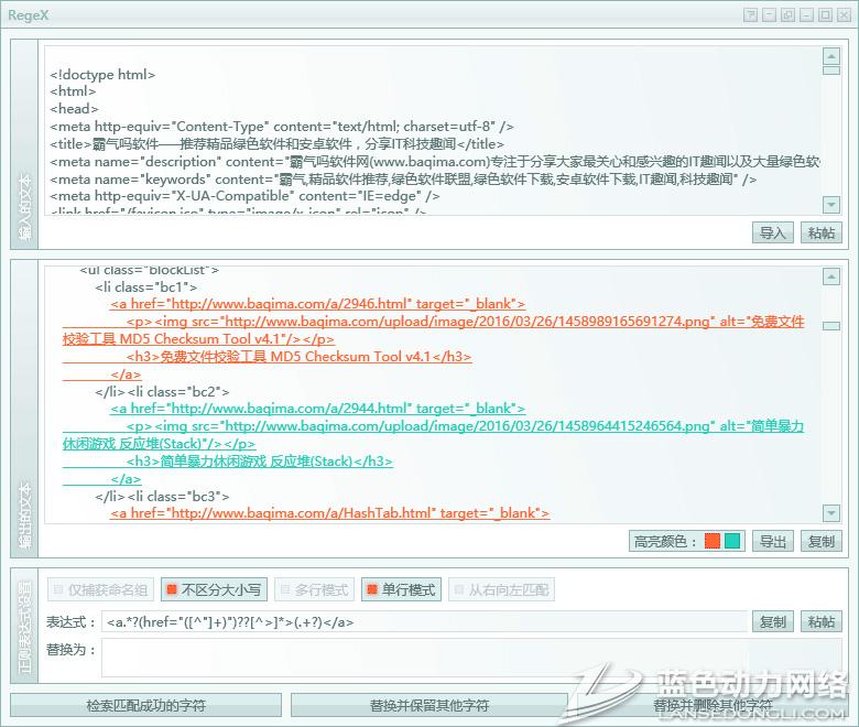 RegeX是一款正则表达式辅助程序,它通过高亮匹配及替换内容使整个流程可视化,帮助用户更好地理解和使用正则表达式这一强力工具。RegeX定位为免费软件,任何人都可无限制的使用它。运行RegeX需要.Net Framework 3.5。