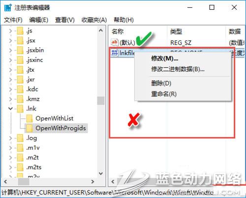 6、然后点击openwithprogids,在右边中看看除了“默认”这个外,有没有其他的,有的话也全部删除。