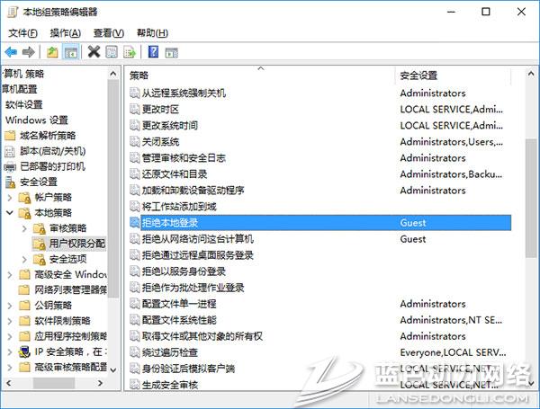 更新:根据提供的方法,在组策略中进入计算机配置→Windows设置→安全设置→本地策略→用户权限分配,找到“拒绝本地登录”。双击进入属性设置,然后选中Guest,并且点击“删除”,即可恢复系统默认来宾账户登录。