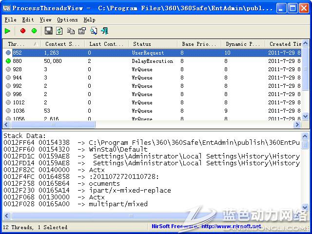 ProcessThreadsView是一个小工具,显示有关您选择的过程中,所有线程的信息。线程的信息包括的ThreadID,上下文切换次数,优先级,创建时间,用户/内核时间,窗口数量,窗口标题,起始地址,以及更多。