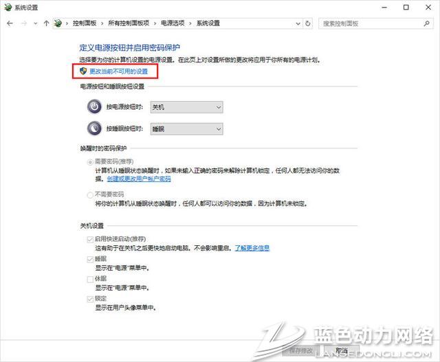 4、点击“更改当前不可用的设置”,并且关闭快速启动(关闭快速启动是恢复F8进高级启动的前提);(补充:虽然网上这样介绍,但实际上,有时不关闭快速启动也是可以的。至少在这次试验中,我所用的测试平台,就不用关闭快速启动,依旧可以按F8进高级启动选项。)