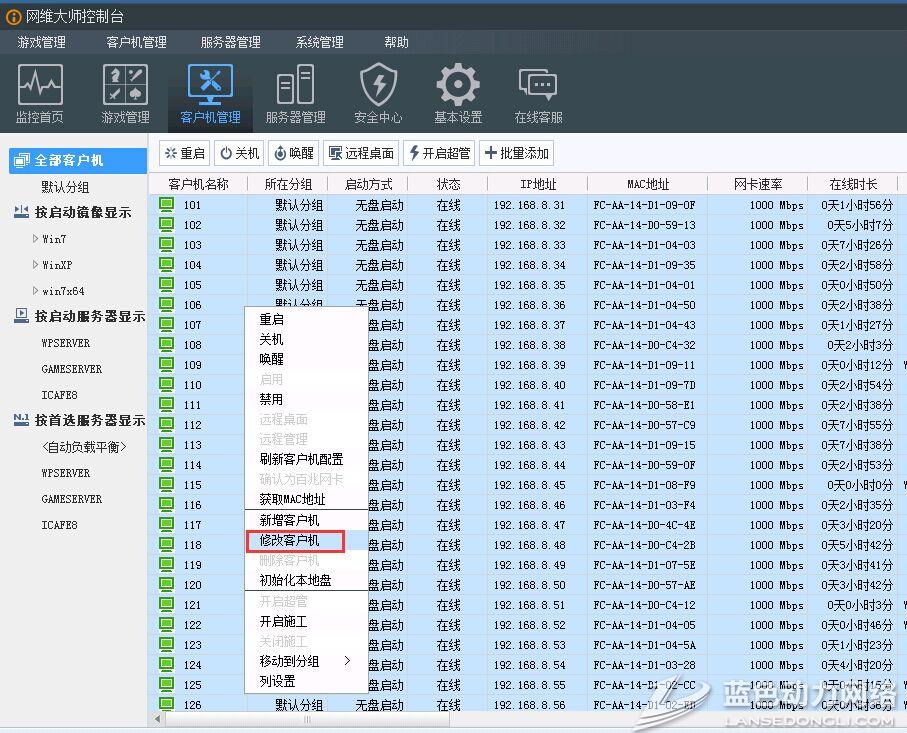 回到主服务器,选择客户机管理,选择客户机修改