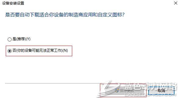 鼠标右击桌面上的此电脑,进入属性,选择高级系统设置(界面左栏),然后是硬件、设备安装设置(S)、否(若有“让我选择要执行的操作”,则勾上“从不安装来自Windows更新的驱动程序软件”)即可;