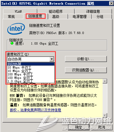 网卡速率是网卡硬件本身决定的,可由驱动程序决定网卡速率,一般情况下,我们只需要在网卡属性高级里设置网卡的速率即可,通常设置均为自动(自适应),如果你需要设置固定可以根据如下操作设置: