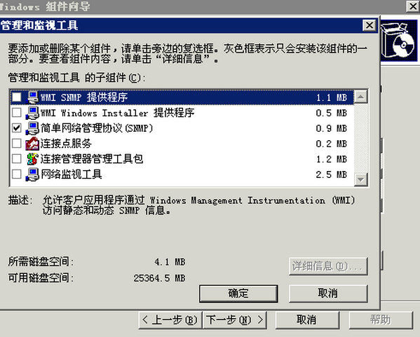 1,开始--控制面板--添加删除程序--添加删除组件--管理和监视工具--然后勾上简单网络管理协议--点击确定,下一步开始安装