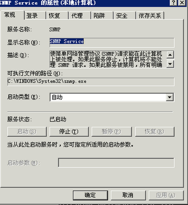 系统就会自动开始安装,在安装过程需要有一些系统文件,完成安装后点击开始--控制面板--服务,找到snmp service服务,选择属性把启动类型改为自动,然后启动这个服务,如果有打开防火墙的话请把uid161的端口打开