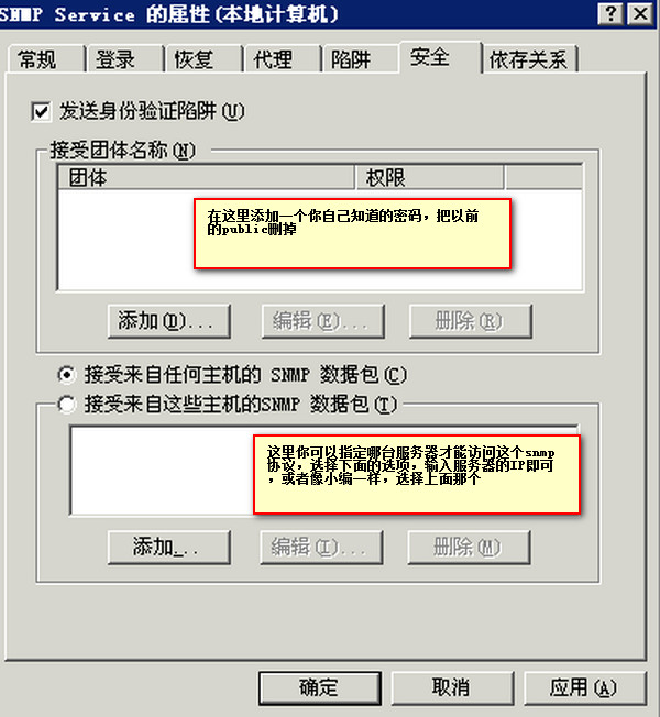 2,安装完成后,为了这个协议的安全性能高,所以在使用时都会用自己设定的团体名称(这个团体名称你可以理解为密码), 在上图的属性中,有个安全的页面,点击进入