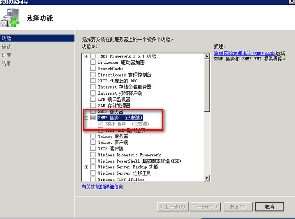 1 开始--管理工具--服务器管理器--添加功能--添加snmp协议