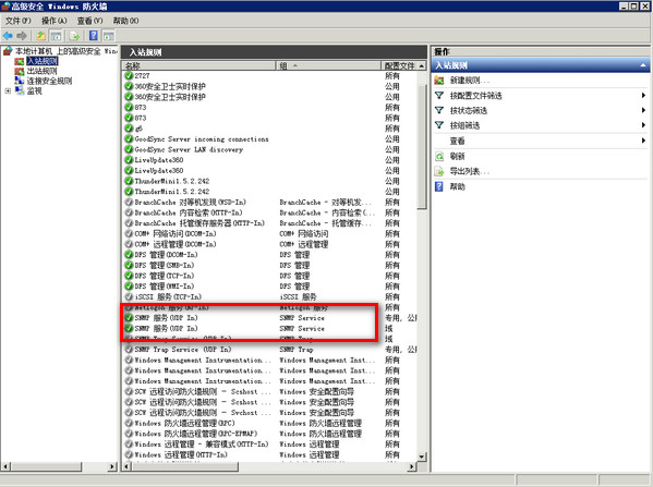2 完成后同2003系统一样,打开snmp服务 ,添加安全密码等等。这里就不啰嗦了,弄不明白的可以往上看,(windows2008系统,有时候安装完snmp协议后没有安全这个选项,这个是bug 只需要注销一下你的服务器就可以了),这里要提的是windows2008的防火墙设置,它与2003的不同,它不需要打开161端口,因为它的防火墙中snmp有自己的设置页面